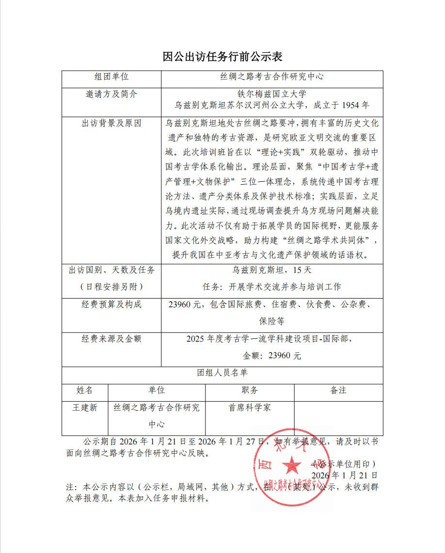 丝绸之路考古合作研究中心出国公示(2026-02)
