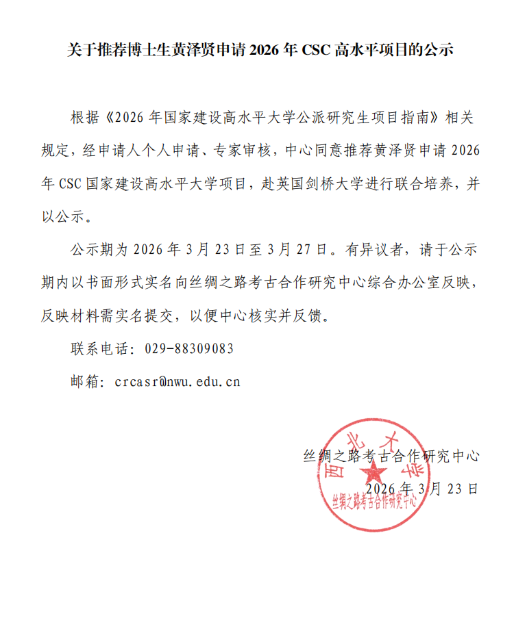 关于推荐博士生黄泽贤申请2026年CSC 高水平项目的公示